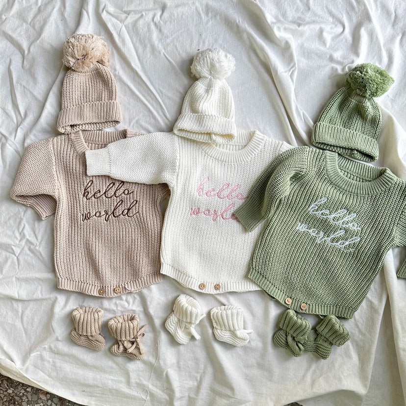 Celebrate your little one’s arrival with this timeless knit set. Crafted from soft, breathable cotton, it includes a cozy long-sleeve romper embroidered with hello world and a matching pom-pom hat/beanie. Gentle on delicate skin and perfect for gifting or first photos.